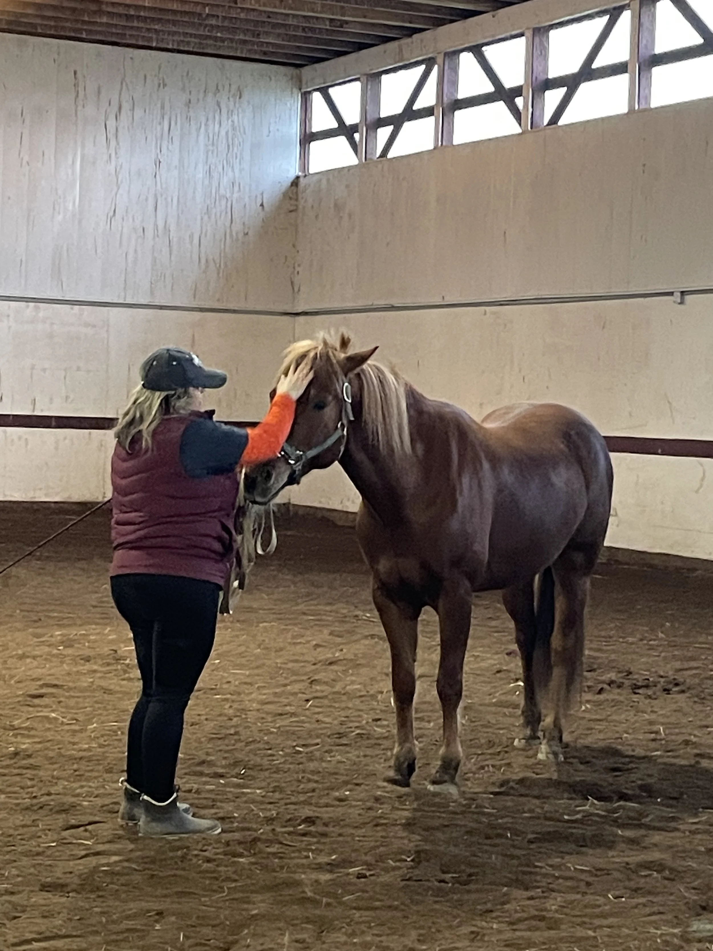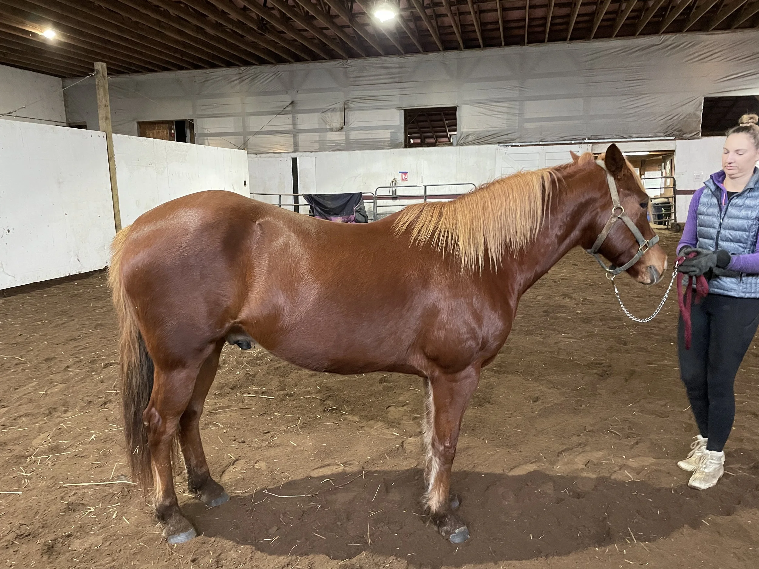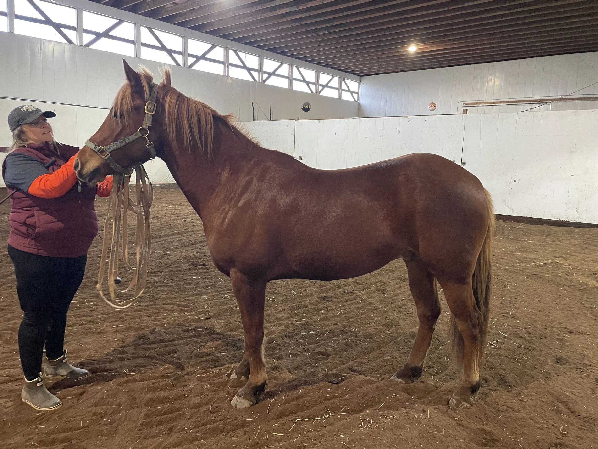 Joe has worked with trainer Patty Chilson of CC Stables to build trust and essential skills, and he continues to excel, now working on Liberty training with one of our schoolers. He’s thriving and learning every day, preparing for a forever home where he can share his wonderful energy and joy.